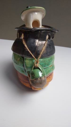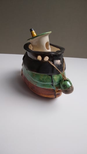 This trawler is based on the fishing boats in the working harbour where I live. Each trawler takes several weeks to make and they develop during the making process. The final finish is decided and applied. The fenders are hand modeled and glazed to enhance the piece often being finished in contrasting colours.